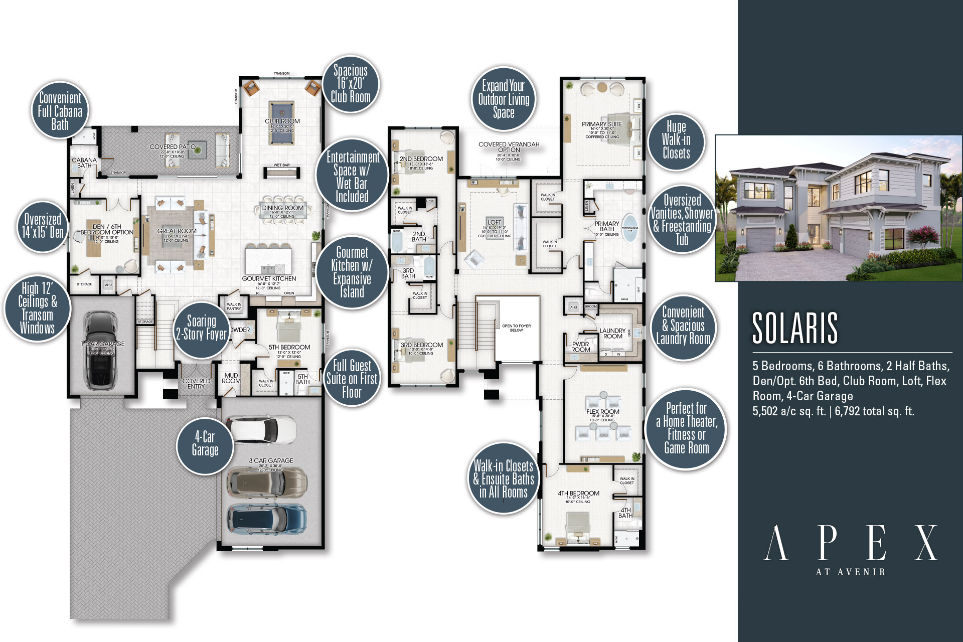 The brand-new Solaris home design at APEX at Avenir takes modern luxury living to a new level. Featuring over 5,500 sq. ft., the Solaris sets a new standard for modern luxury living with 5 bedrooms, 6 full and 2 half bathrooms, den/opt. 6th bedroom, club room, loft, and flex room. Designed for entertaining, the first floor showcases soaring 12-foot ceilings and two-story ceilings in the foyer, a stunning open-concept layout that seamlessly connects the kitchen, dining area, club room, and great room. Every detail is elevated, from the expansive 4-car garage to the private retreats upstairs where each bedroom features its own walk-in closet and ensuite bath. Plus, like every home at APEX, you'll have an impressive array of included features to choose from, like impact-resistant windows, 24x24 porcelain floor tile, engineered wood flooring on stairs, and designer brick pavers on the driveway, entry walkway, covered entry, and patio.