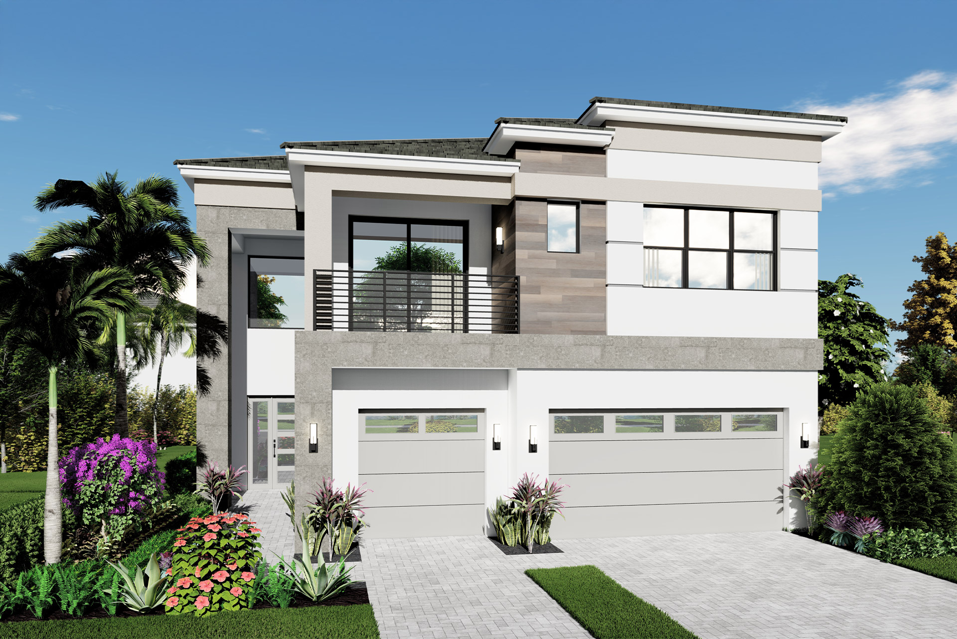 - Landscape package featuring fully sodded homesites, curated shrubs, a Fishtail palm privacy hedge along the rear property line, and an automatic irrigation system with timer clock and rain sensor