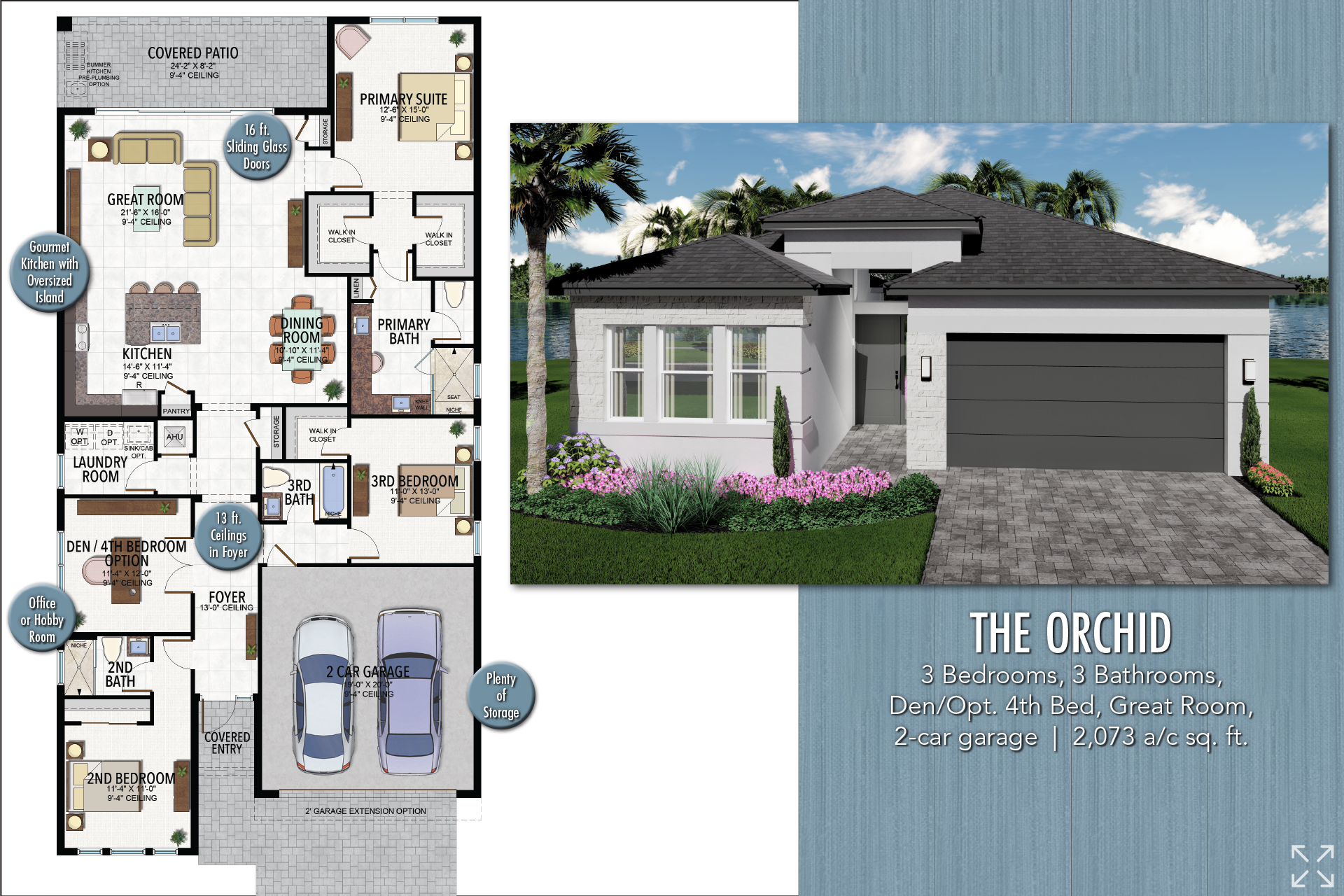 Introducing the new Orchid floorplan at Valencia Ridge, now the largest home in the Signature Collection. This beautifully designed home features 13 ft. ceilings in the foyer, an open concept kitchen with a large oversized island, and expansive 16 ft. sliding glass doors that open to the lanai and fill the home with natural light. A versatile den with double doors allows you to create a space that fits your needs, whether it’s a hobby room, guest retreat, or exercise studio. You’ll also have additional standout features like three full bathrooms, plenty of storage, and two walk-in closets. Plus, like every home at Valencia Ridge, you’ll have an impressive variety of included features to choose from, like quartz countertops, stainless-steel appliance package, oversized tile flooring, and brick pavers on the driveway, walkways, covered entry, and patio.