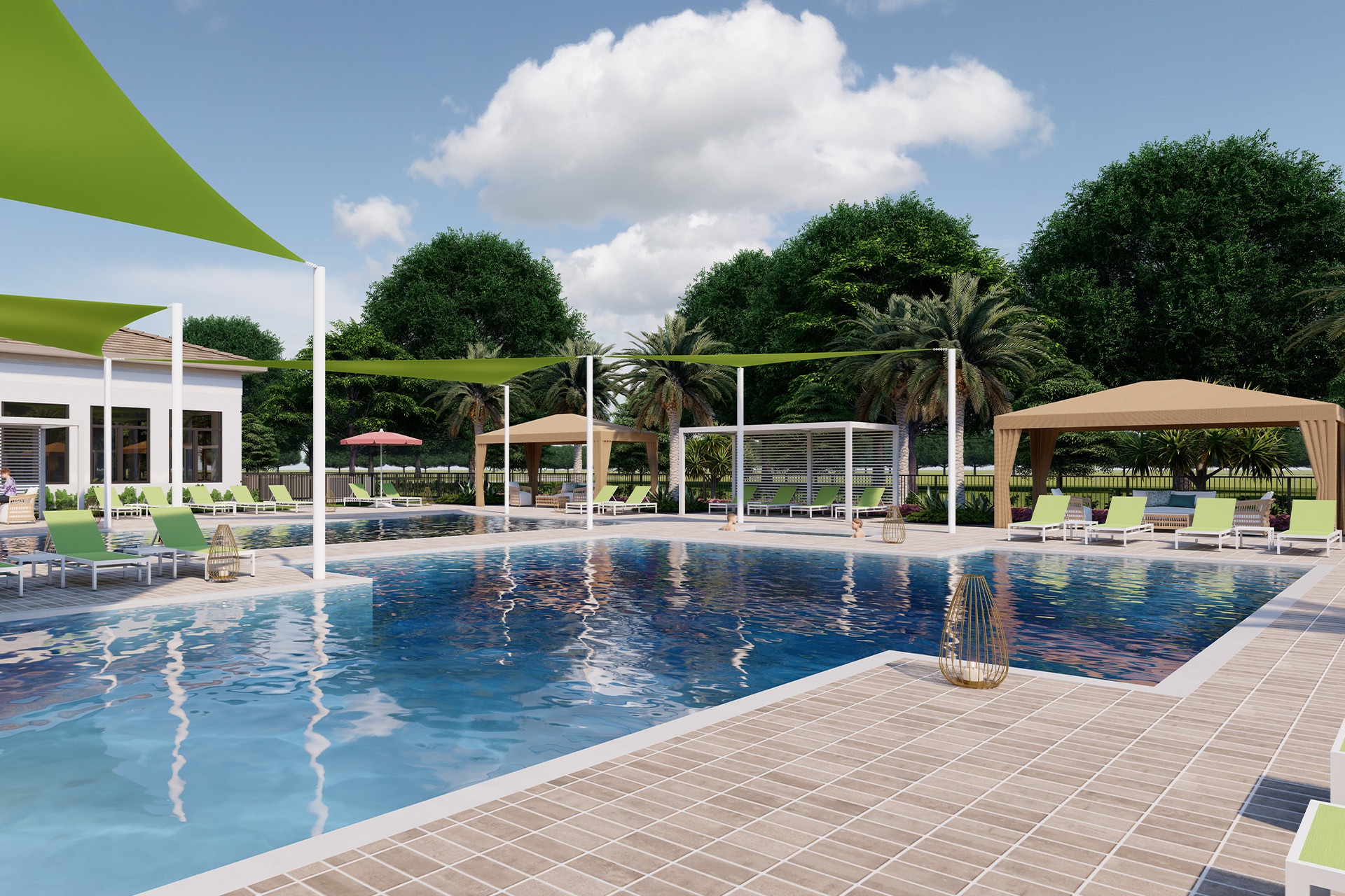 Enjoy a resort-style pool with a shaded beach entry, a resistance exercise pool, and shaded lap swimming lanes. Relax in the whirlpool spa or unwind under the shaded cabanas. The pool area also features a fireplace with cozy seating, and elevated chaise lounges.