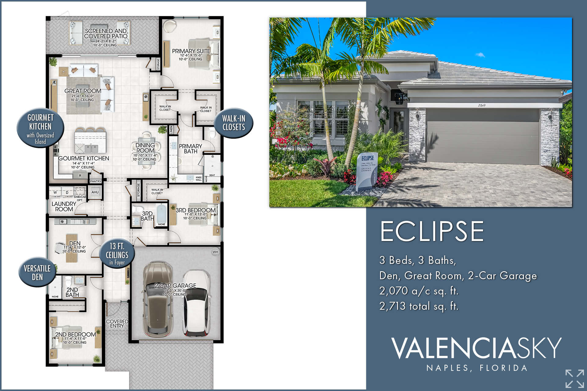Visit today and see why the Eclipse is the most popular home design at Valencia Sky. The Eclipse in the Valencia Sky Collection features an open layout with 3 bedrooms, 3 bathrooms, den, great room, and a 2-car garage. With 2,070 air-conditioned square feet of living space, the Eclipse has all the room you need from the inside out and features a spacious screened and covered patio that’s perfect for enjoying the beautiful year-round Florida weather. You’ll love 13ft ceilings in the foyer, versatile den, primary suite with two oversized walk-in closets, and open-concept living areas. Featuring a gourmet kitchen with quartz or granite countertops, ceramic floor tile, and many more luxury standard features, at Valencia Sky, you’ll have access to the best 55+ lifestyle in Naples and world-class resort amenities right in your backyard.